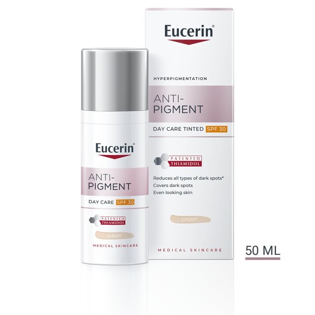 Eucerin® Anti-Pigment šviesaus atspalvio dieninio kremo SPF 30 sudėtyje yra Thiamidol® – veiksmingos ir unikalios veikliosios medžiagos, kuri kovoja su hiperpigmentacijos priežastimi, mažindama melanino gamybą nuo pirmos dienos. Pirmieji matomi rezultatai pasiekiami po 2 savaičių naudojant reguliariai. Klinikiniai ir dermatologiniai tyrimai įrodė, kad sumažina visų tipų pigmentines dėmes ir padeda užkirsti kelią jų atsiradimui ateityje.