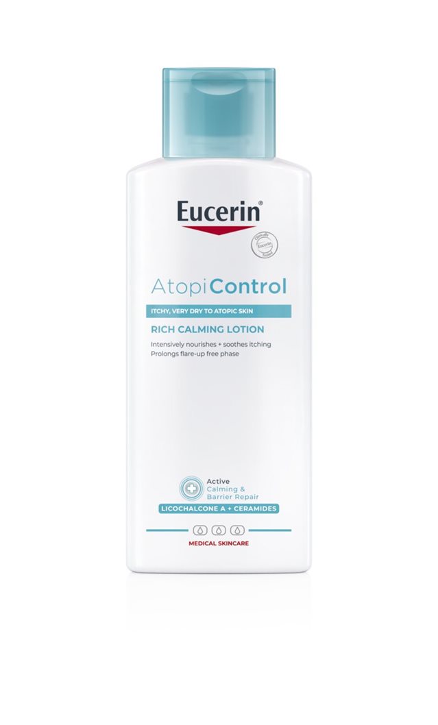 Eucerin AtopiControl losjonas yra skirtas kasdieniam naudojimui, jo formulė specialiai skirta intensyviai drėkinti ir nuraminti sudirgusią, niežtinčią odą. Vandens aliejuje losjonas lengvai susigeria, jo sudėtyje yra raminančiomis savybėmis pasižyminčio likochalkono A, keramidų ir omega aliejų, kad sustiprėtų odos barjeras, sumažėtų sausumas, niežėjimas bei pailgėtų laikotarpis tarp atopinio dermatito paūmėjimų. Naudojant reguliariai, odos būklė pastebimai pagerėja, oda tampa lygesnė ir švelnesnė.