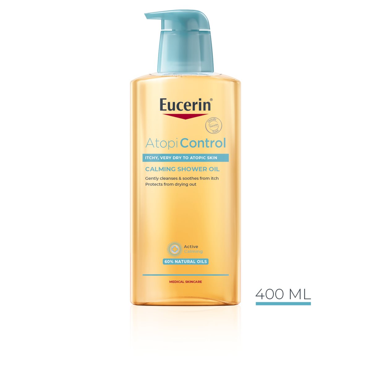 Eucerin AtopiControl vonios ir dušo aliejus yra bemuilė prausimosi priemonės, kurios sudėtyje yra didelė koncentracija omega 3 ir omega 6 aliejų, švelniai nuprausiančių bei nuraminančių atopinio dermatito ar atopinės egzemos paveiktą odą. Šis aliejus palengvina niežėjimą ir palaiko natūralų odos barjerą. Oda apsaugoma nuo tolesnio išsausėjimo ir niežėjimo net ir dažnai prausiantis.