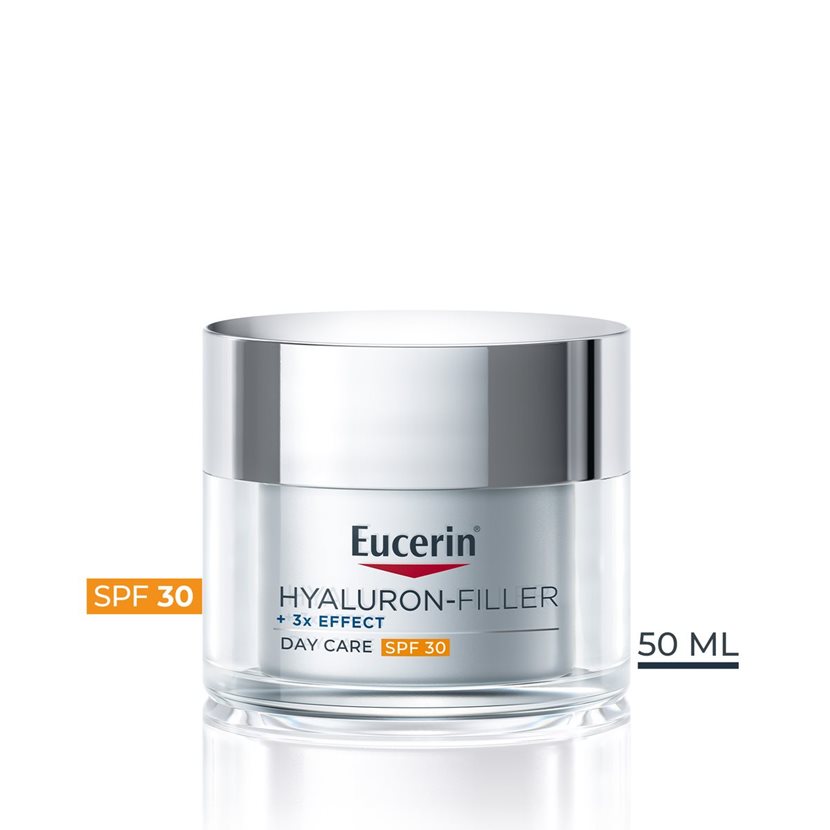Eucerin Hyaluron-Filler +3x Effect priemonių linija yra specialiai sukurta pirmųjų odos senėjimo požymių matomumui mažinti. Šie požymiai - tai smulkios raukšlelės ir vis labiau gilėjančios raukšlės, kurios dažniausiai išryškėja sulaukus maždaug 30-ties ir yra nulemtos genetikos bei gyvenimo būdo veiksnių. Eucerin Hyaluron-Filler +3x Effect dieninio kremo SPF 30 sudėtyje yra mažos ir didelės molekulinės masės hialurono rūgšties derinys, pastebimai sumažinantis raukšlių matomumą ir intensyviai bei ilgam drėkinantis odą.